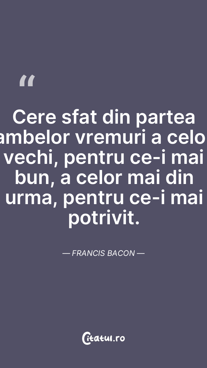 Cere sfat din partea ambelor vremuri a celor vechi, pentru ce-i mai bun, a celor mai din urma, pentru ce-i mai potrivit. Francis Bacon
