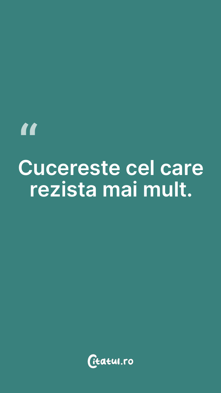 Cucereste cel care rezista mai mult. ... Categorie: citate spiritualitate Dificultate: Foarte ușor de citit! Votează: ★ ★ ★ ★ ★ (0/5 din 0) Distribuiți acest citat? Alegeți platforma preferată: Salvează citatul in telefon/pc Cucereste cel care rezista mai mult. Copiază Favorite Eroare