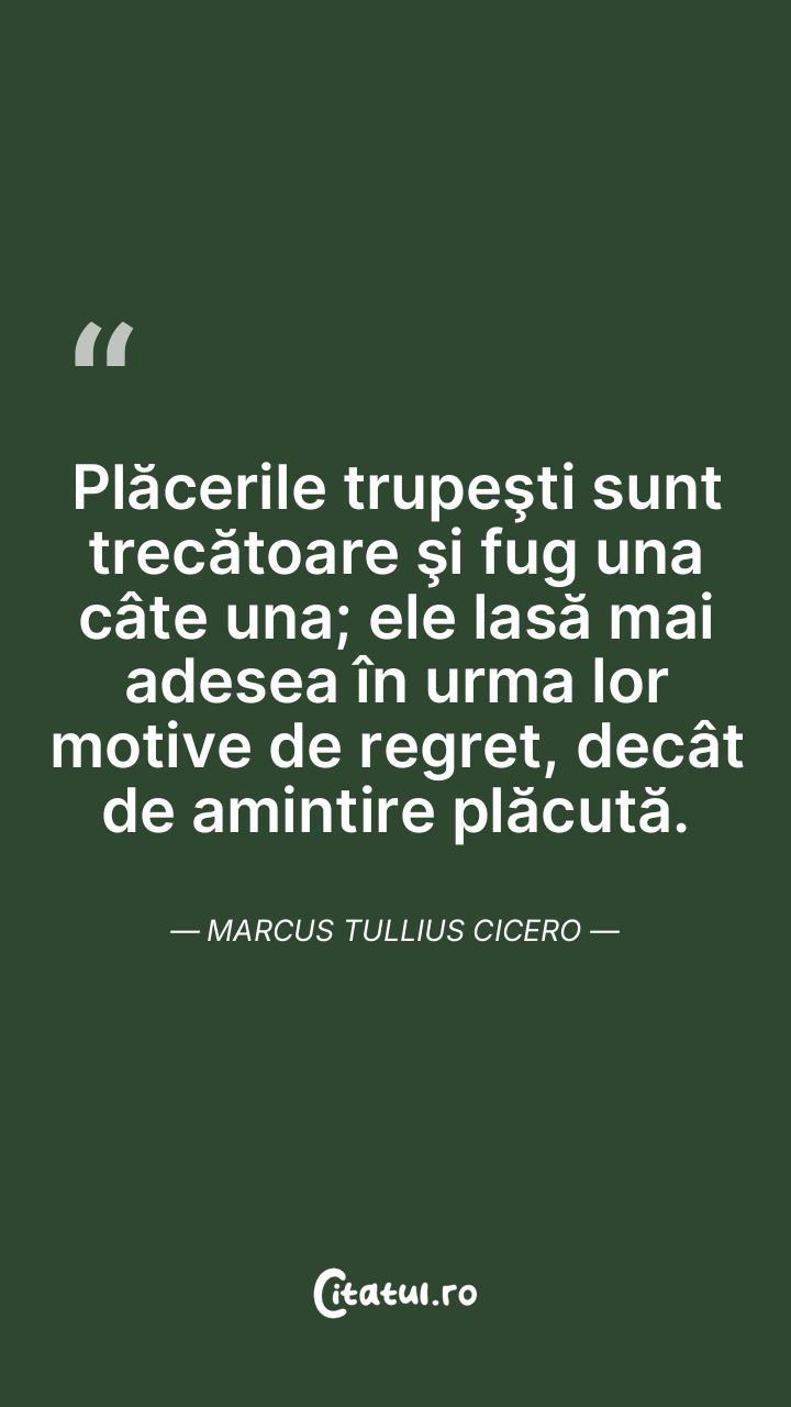 Plăcerile trupeşti sunt trecătoare şi fug una câte una; ele lasă mai adesea în urma lor motive de regret, decât de amintire plăcută. Marcus Tullius Cicero