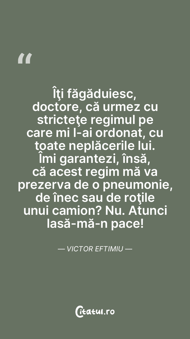 Îţi făgăduiesc, doctore, că urmez cu stricteţe regimul pe care mi l-ai ordonat, cu toate neplăcerile lui. Îmi garantezi, însă, că acest regim mă va prezerva de o pneumonie, de înec sau de roţile unui camion? Nu. Atunci lasă-mă-n pace! Victor Eftimiu