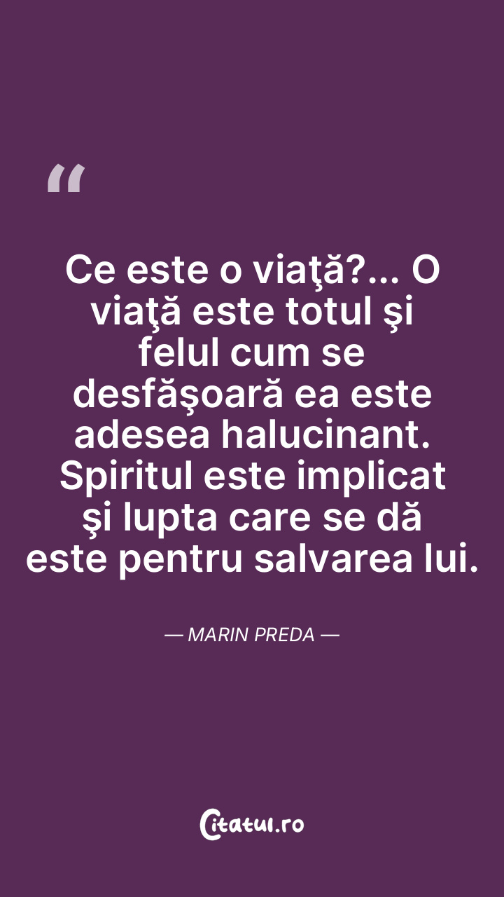 Ce este o viaţă?... O viaţă este totul şi felul cum se desfăşoară ea este adesea halucinant. Spiritul este implicat şi lupta care se dă este pentru salvarea lui. Marin Preda