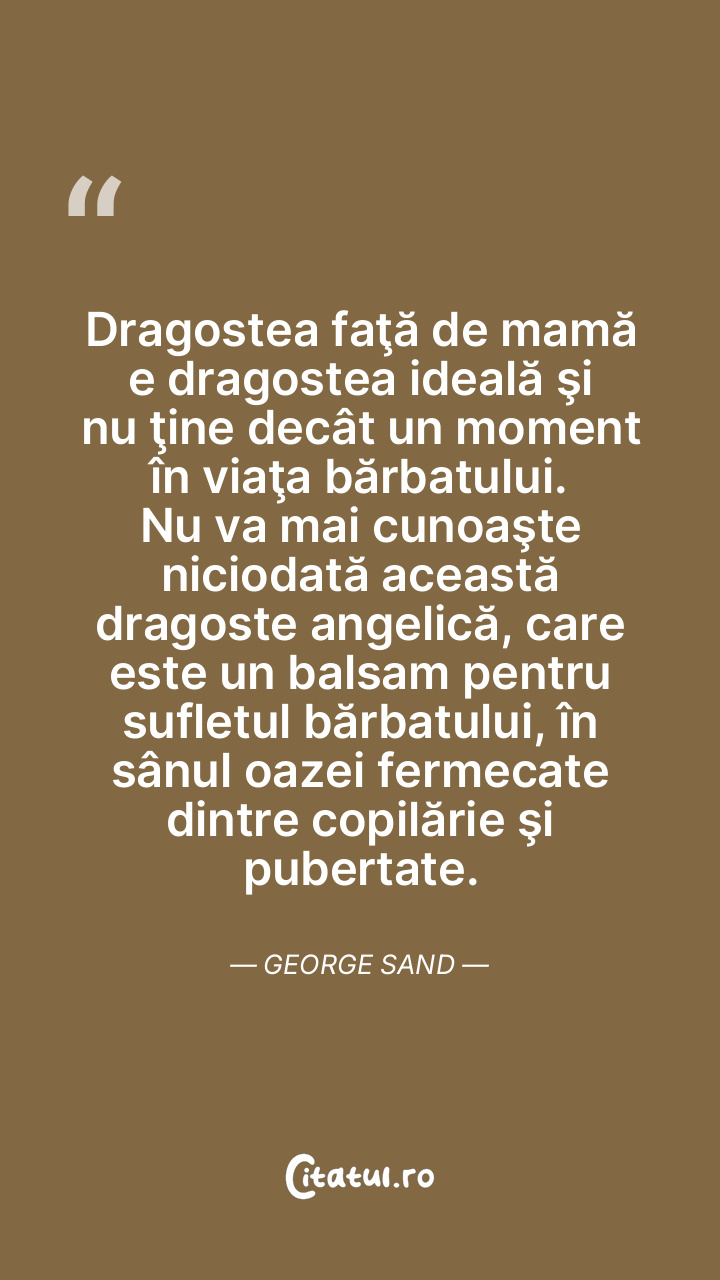 Dragostea faţă de mamă e dragostea ideală şi nu ţine decât un moment în viaţa bărbatului. Nu va mai cunoaşte niciodată această dragoste angelică, care este un balsam pentru sufletul bărbatului, în sânul oazei fermecate dintre copilărie şi pubertate. George Sand