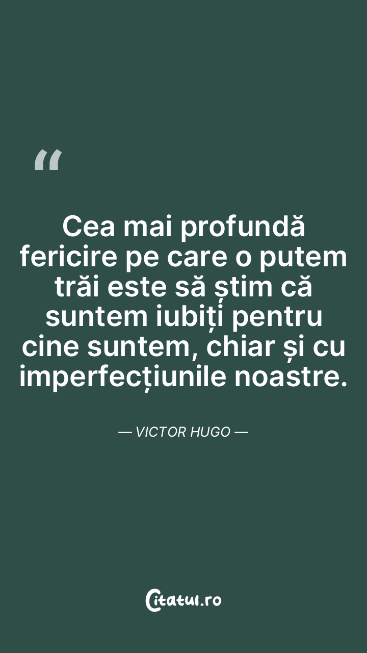 Cea mai profundă fericire pe care o putem trăi este să știm că suntem iubiți pentru cine suntem, chiar și cu imperfecțiunile noastre. Victor Hugo