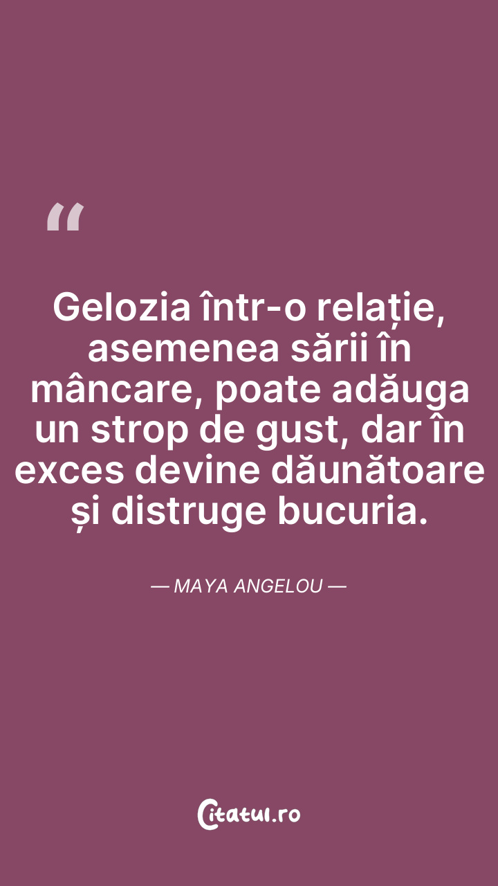 Gelozia într-o relație, asemenea sării în mâncare, poate adăuga un strop de gust, dar în exces devine dăunătoare și distruge bucuria. Maya Angelou