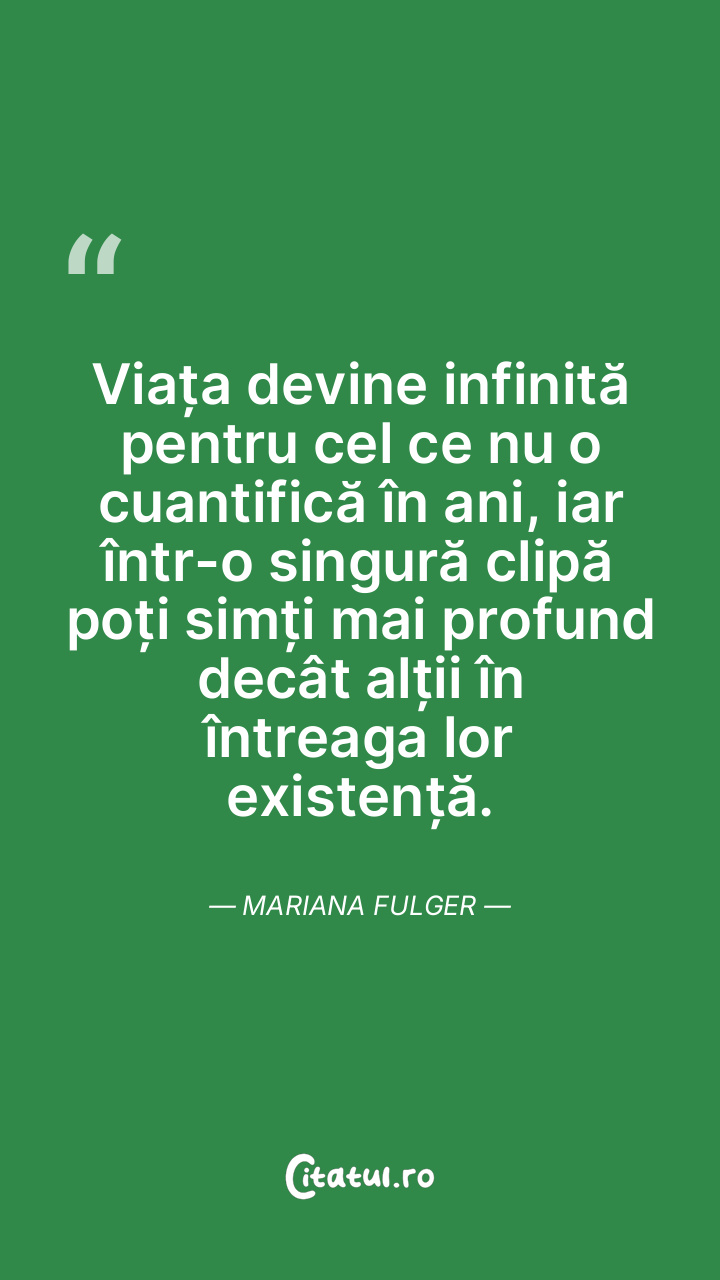 Viața devine infinită pentru cel ce nu o cuantifică în ani, iar într-o singură clipă poți simți mai profund decât alții în întreaga lor existență. Mariana Fulger