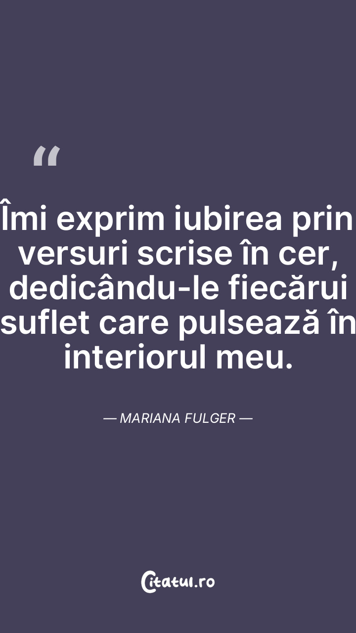 Îmi exprim iubirea prin versuri scrise în cer, dedicându-le fiecărui suflet care pulsează în interiorul meu. Mariana Fulger