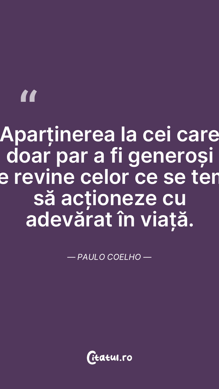 Aparținerea la cei care doar par a fi generoși le revine celor ce se tem să acționeze cu adevărat în viață. Paulo Coelho