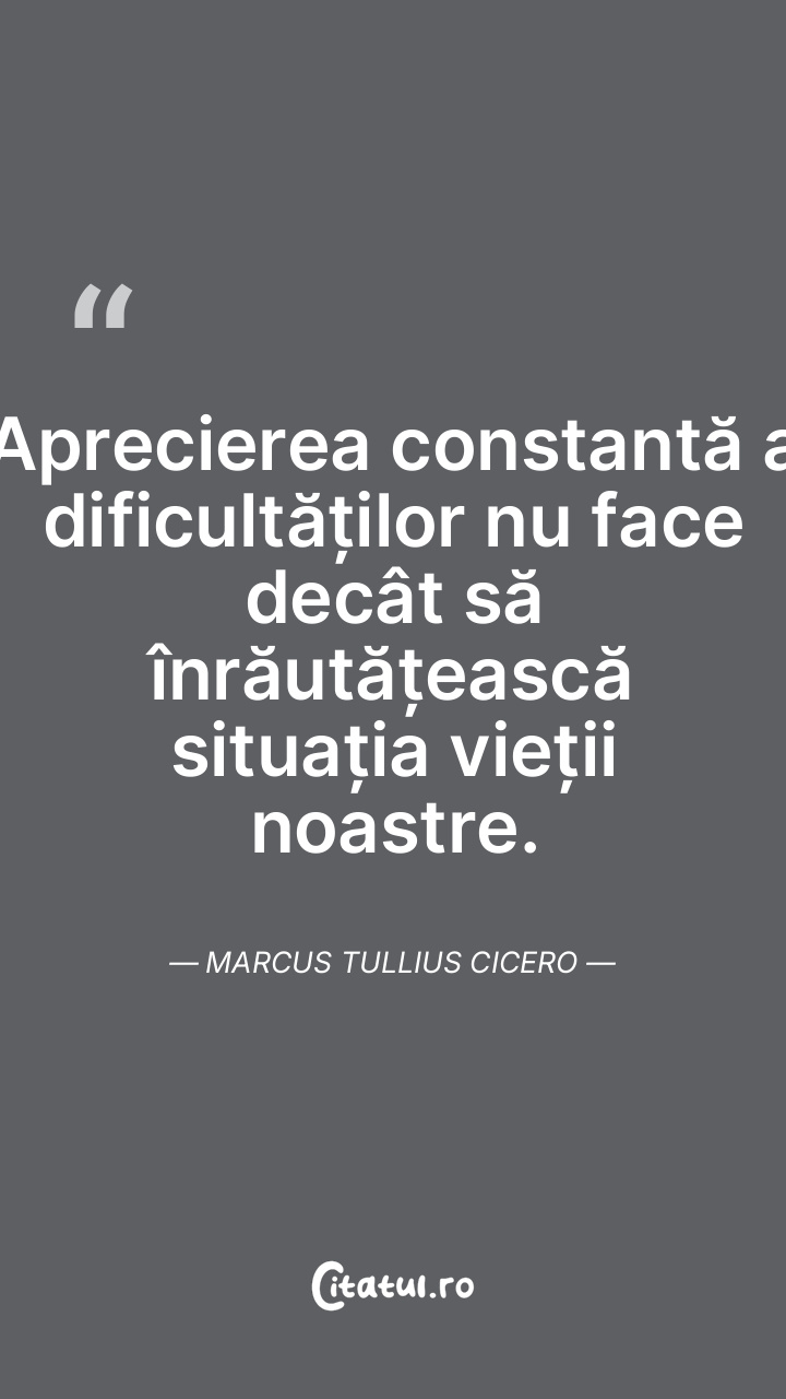 Aprecierea constantă a dificultăților nu face decât să înrăutățească situația vieții noastre. Marcus Tullius Cicero