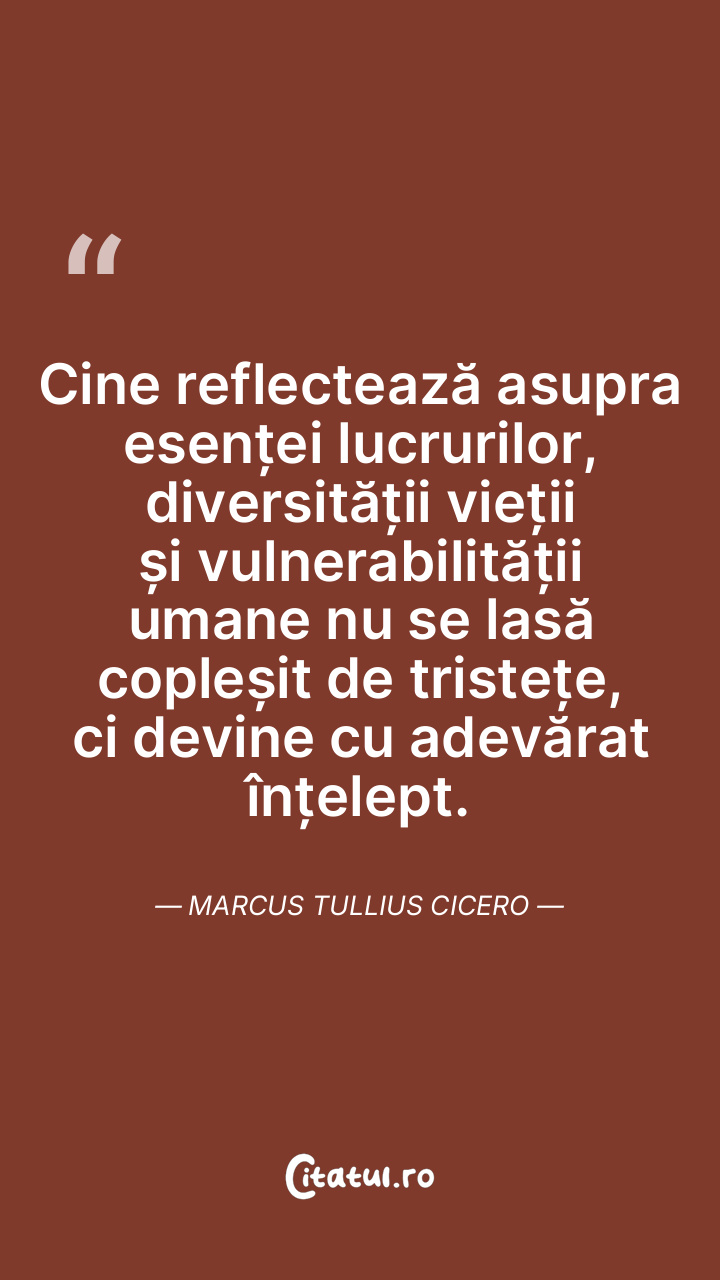 Cine reflectează asupra esenței lucrurilor, diversității vieții și vulnerabilității umane nu se lasă copleșit de tristețe, ci devine cu adevărat înțelept. Marcus Tullius Cicero