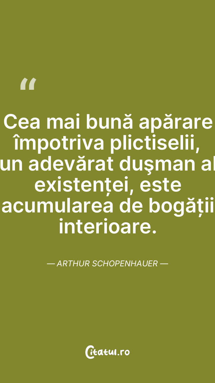 Cea mai bună apărare împotriva plictiselii, un adevărat duşman al existenței, este acumularea de bogății interioare. Arthur Schopenhauer