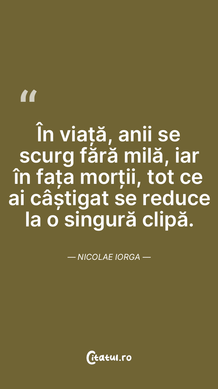 În viață, anii se scurg fără milă, iar în fața morții, tot ce ai câștigat se reduce la o singură clipă. Nicolae Iorga