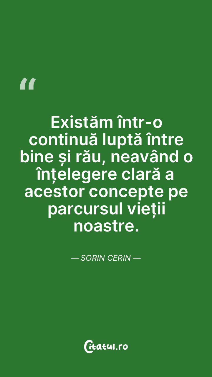 Existăm într-o continuă luptă între bine și rău, neavând o înțelegere clară a acestor concepte pe parcursul vieții noastre. Sorin Cerin