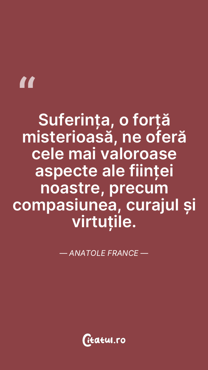 Suferința, o forță misterioasă, ne oferă cele mai valoroase aspecte ale ființei noastre, precum compasiunea, curajul și virtuțile. Anatole France