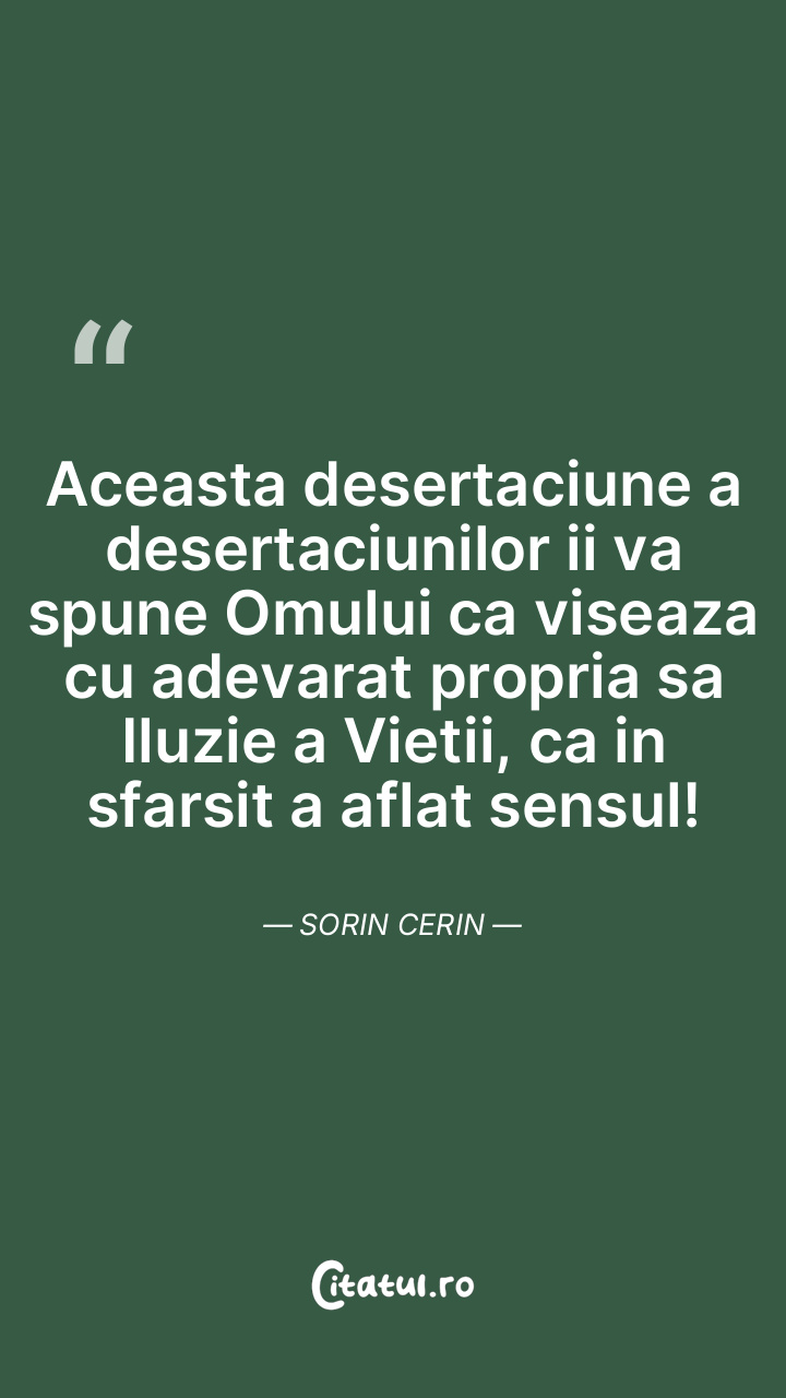 Aceasta desertaciune a desertaciunilor ii va spune Omului ca viseaza cu adevarat propria sa Iluzie a Vietii, ca in sfarsit a aflat sensul! Sorin Cerin