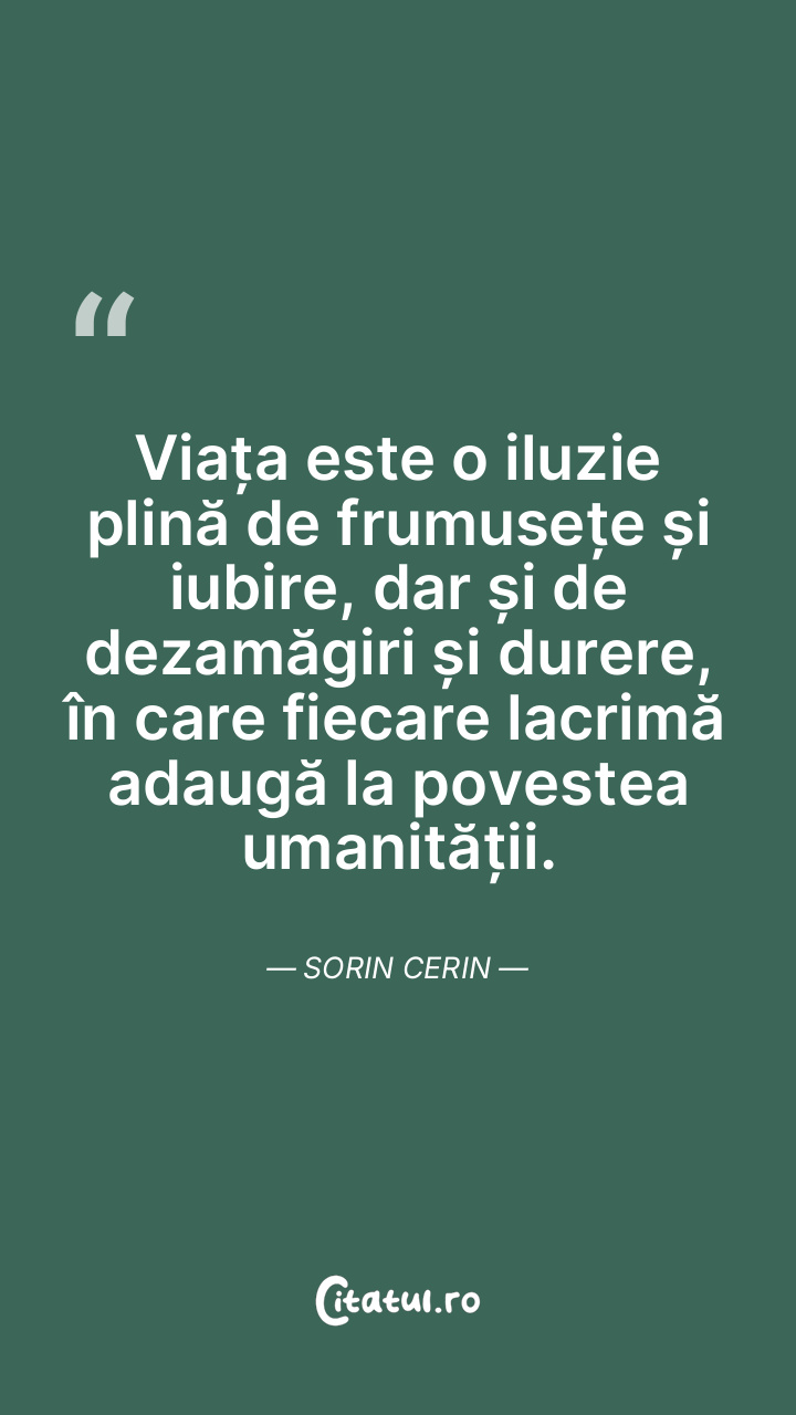 Viața este o iluzie plină de frumusețe și iubire, dar și de dezamăgiri și durere, în care fiecare lacrimă adaugă la povestea umanității. Sorin Cerin