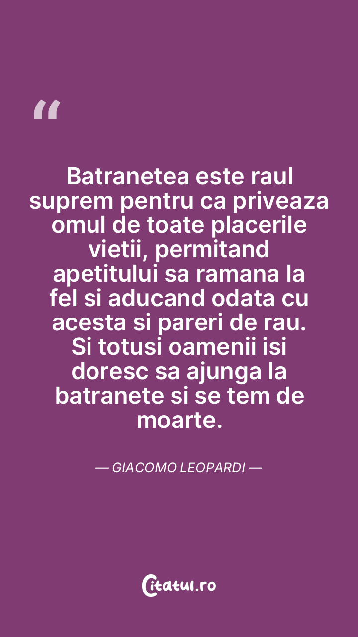 Batranetea este raul suprem pentru ca priveaza omul de toate placerile vietii, permitand apetitului sa ramana la fel si aducand odata cu acesta si pareri de rau. Si totusi oamenii isi doresc sa ajunga la batranete si se tem de moarte. Giacomo Leopardi