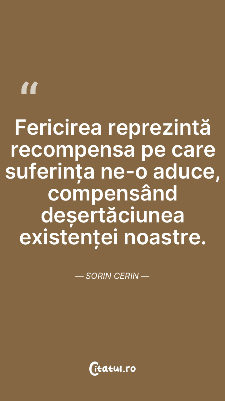 Fericirea reprezintă recompensa pe care suferința ne-o aduce, compensând deșertăciunea existenței noastre. Sorin Cerin