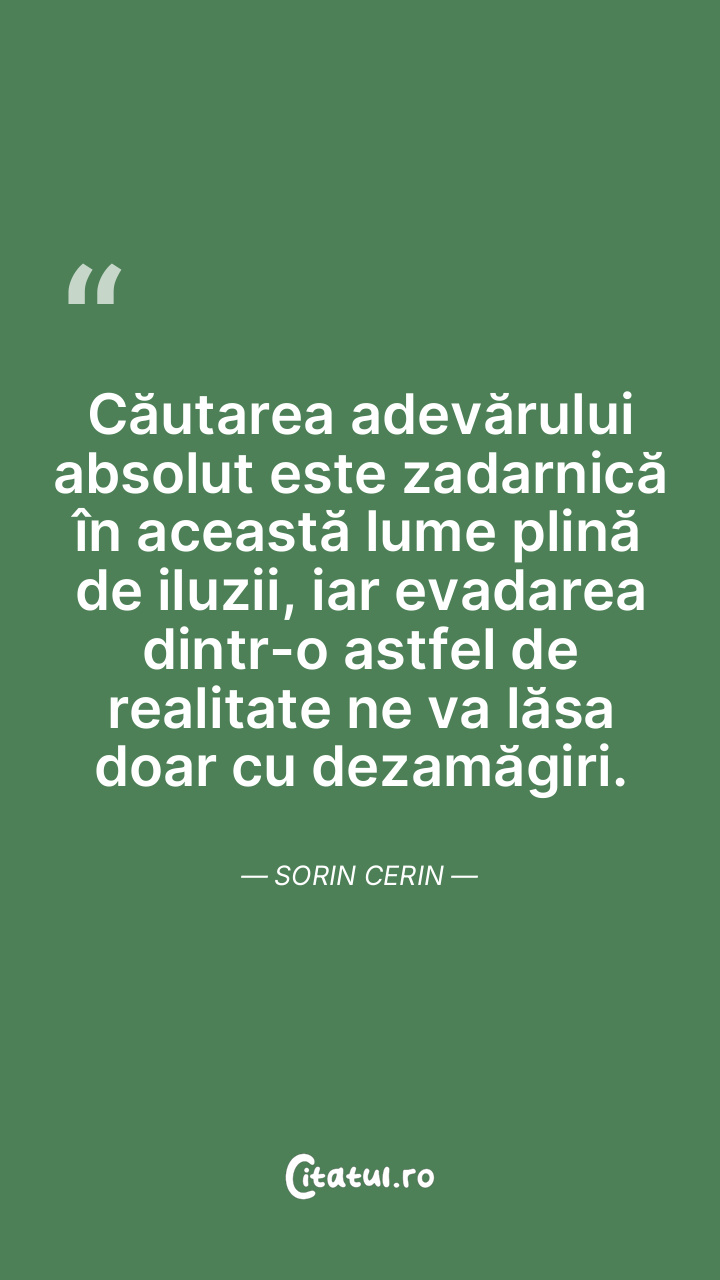 Căutarea adevărului absolut este zadarnică în această lume plină de iluzii, iar evadarea dintr-o astfel de realitate ne va lăsa doar cu dezamăgiri. Sorin Cerin