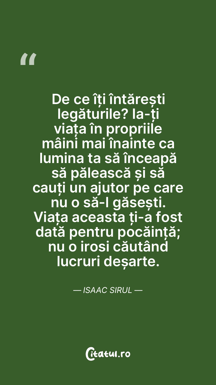 De ce îți întărești legăturile? Ia-ți viața în propriile mâini mai înainte ca lumina ta să înceapă să pălească și să cauți un ajutor pe care nu o să-l găsești. Viața aceasta ți-a fost dată pentru pocăință; nu o irosi căutând lucruri deșarte. Isaac Sirul