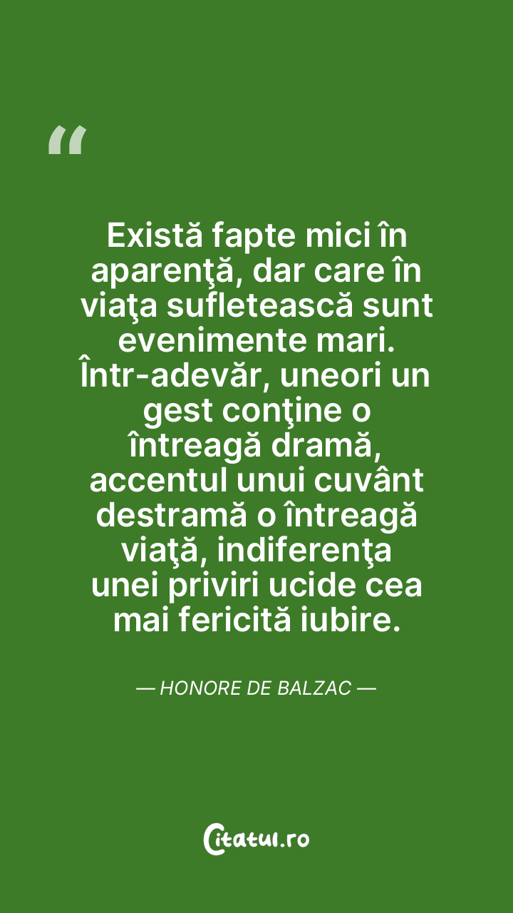 Există fapte mici în aparenţă, dar care în viaţa sufletească sunt evenimente mari. Într-adevăr, uneori un gest conţine o întreagă dramă, accentul unui cuvânt destramă o întreagă viaţă, indiferenţa unei priviri ucide cea mai fericită iubire. Honore de Balzac