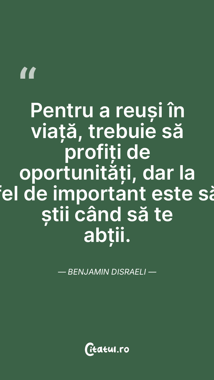 Pentru a reuși în viață, trebuie să profiți de oportunități, dar la fel de important este să știi când să te abții. Benjamin Disraeli