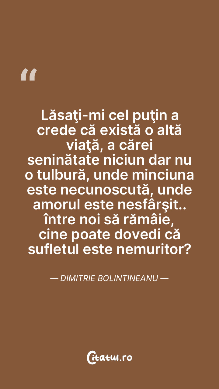 Lăsaţi-mi cel puţin a crede că există o altă viaţă, a cărei seninătate niciun dar nu o tulbură, unde minciuna este necunoscută, unde amorul este nesfârşit.. între noi să rămâie, cine poate dovedi că sufletul este nemuritor? Dimitrie Bolintineanu