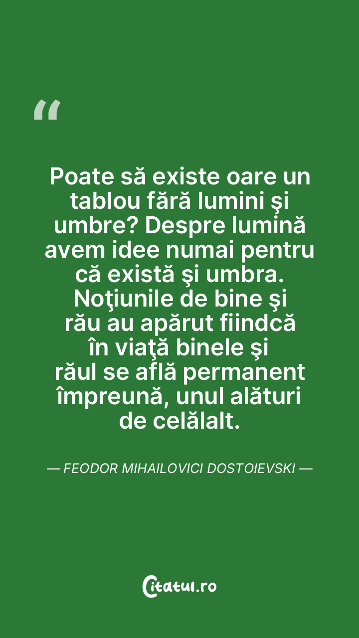 Poate să existe oare un tablou fără lumini şi umbre? Despre lumină avem idee numai pentru că există şi umbra. Noţiunile de bine şi rău au apărut fiindcă în viaţă binele şi răul se află permanent împreună, unul alături de celălalt. Feodor Mihailovici Dostoievski