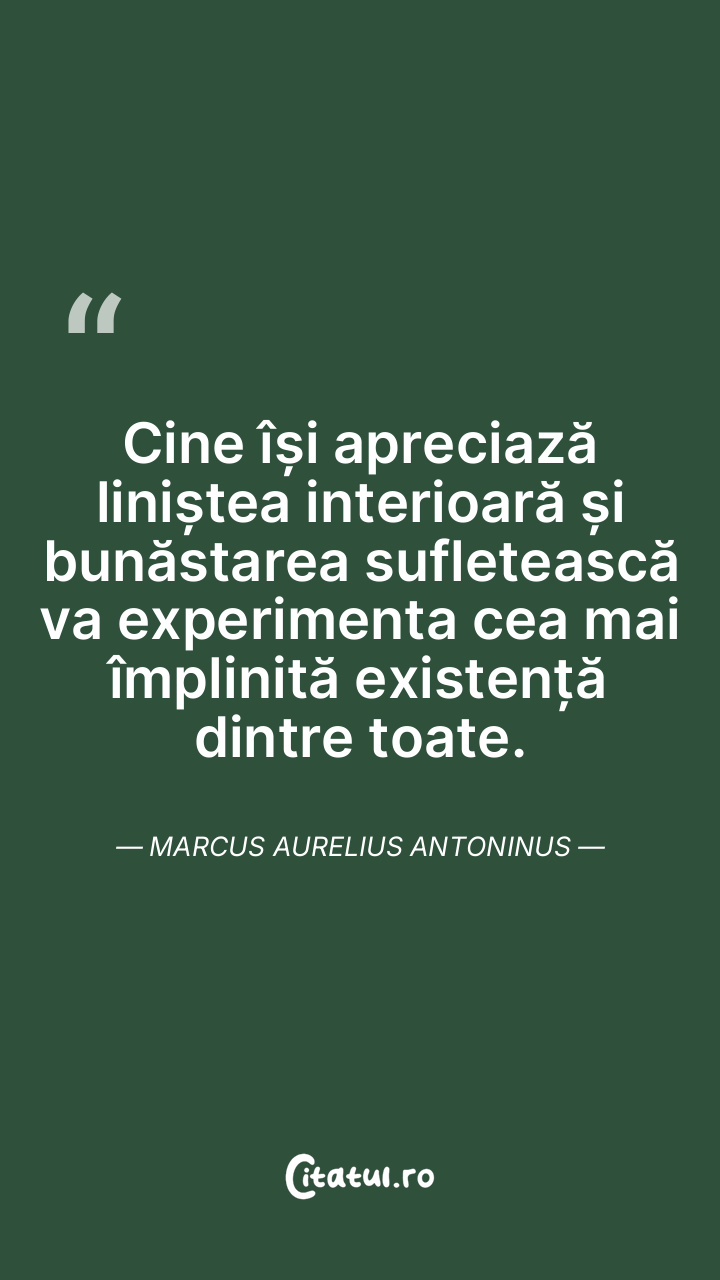 Cine își apreciază liniștea interioară și bunăstarea sufletească va experimenta cea mai împlinită existență dintre toate. Marcus Aurelius Antoninus