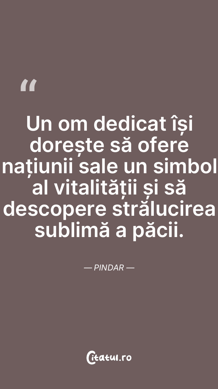 Un om dedicat își dorește să ofere națiunii sale un simbol al vitalității și să descopere strălucirea sublimă a păcii. Pindar