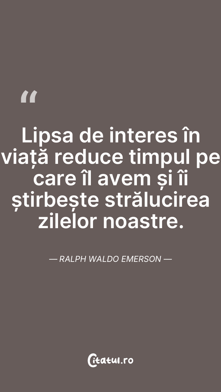Lipsa de interes în viață reduce timpul pe care îl avem și îi știrbește strălucirea zilelor noastre. Ralph Waldo Emerson
