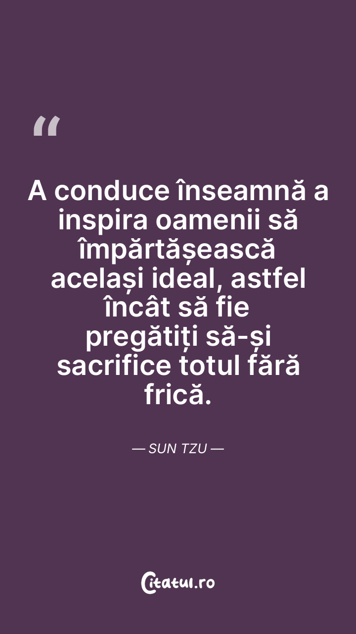 A conduce înseamnă a inspira oamenii să împărtășească același ideal, astfel încât să fie pregătiți să-și sacrifice totul fără frică. Sun Tzu