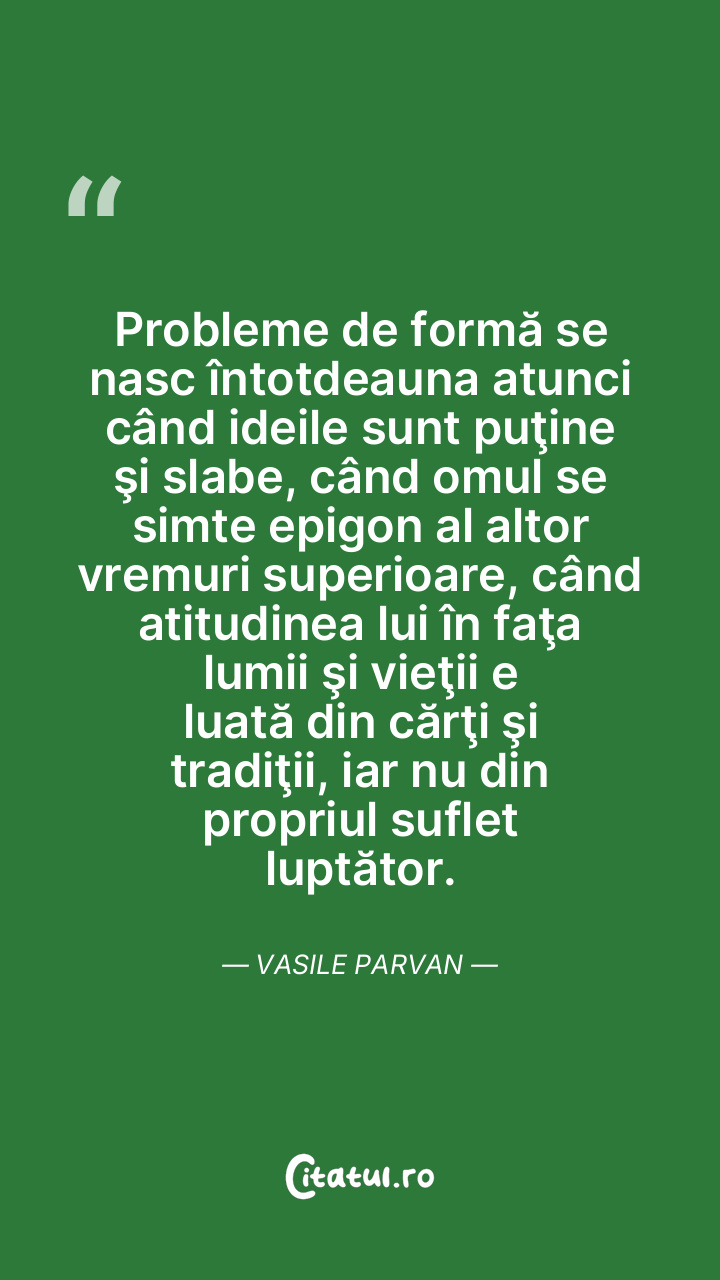 Probleme de formă se nasc întotdeauna atunci când ideile sunt puţine şi slabe, când omul se simte epigon al altor vremuri superioare, când atitudinea lui în faţa lumii şi vieţii e luată din cărţi şi tradiţii, iar nu din propriul suflet luptător. Vasile Parvan