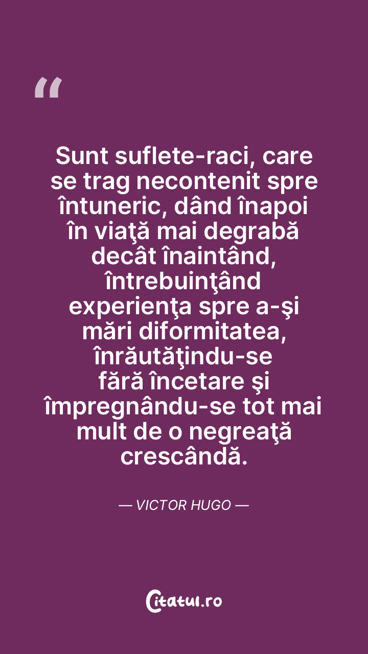 Sunt suflete-raci, care se trag necontenit spre întuneric, dând înapoi în viaţă mai degrabă decât înaintând, întrebuinţând experienţa spre a-şi mări diformitatea, înrăutăţindu-se fără încetare şi împregnându-se tot mai mult de o negreaţă crescândă. Victor Hugo