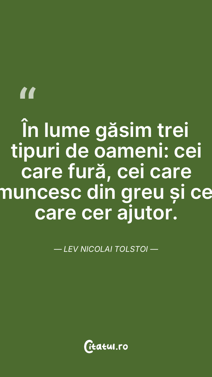 În lume găsim trei tipuri de oameni: cei care fură, cei care muncesc din greu și cei care cer ajutor. Lev Nicolai Tolstoi