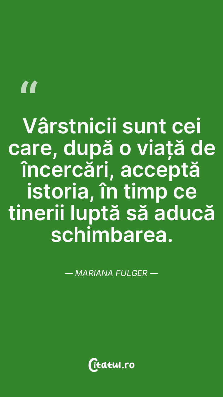 Vârstnicii sunt cei care, după o viață de încercări, acceptă istoria, în timp ce tinerii luptă să aducă schimbarea. Mariana Fulger