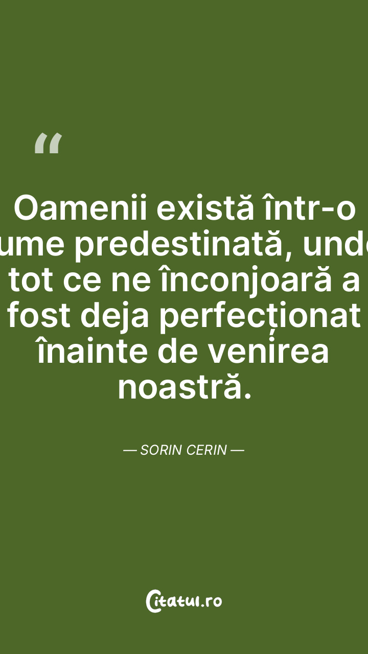 Oamenii există într-o lume predestinată, unde tot ce ne înconjoară a fost deja perfecționat înainte de venirea noastră. Sorin Cerin