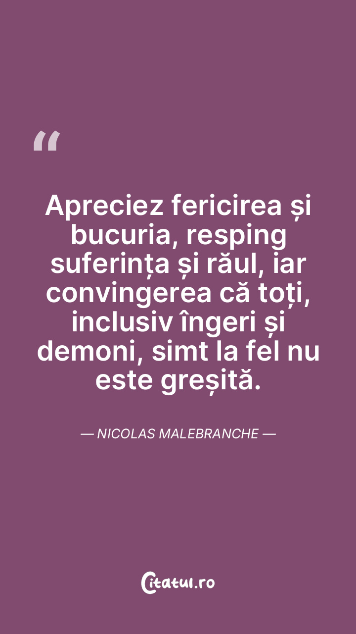 Apreciez fericirea și bucuria, resping suferința și răul, iar convingerea că toți, inclusiv îngeri și demoni, simt la fel nu este greșită. Nicolas Malebranche