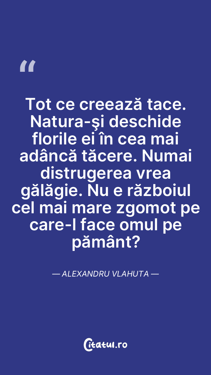 Tot ce creează tace. Natura-şi deschide florile ei în cea mai adâncă tăcere. Numai distrugerea vrea gălăgie. Nu e războiul cel mai mare zgomot pe care-l face omul pe pământ? Alexandru Vlahuta