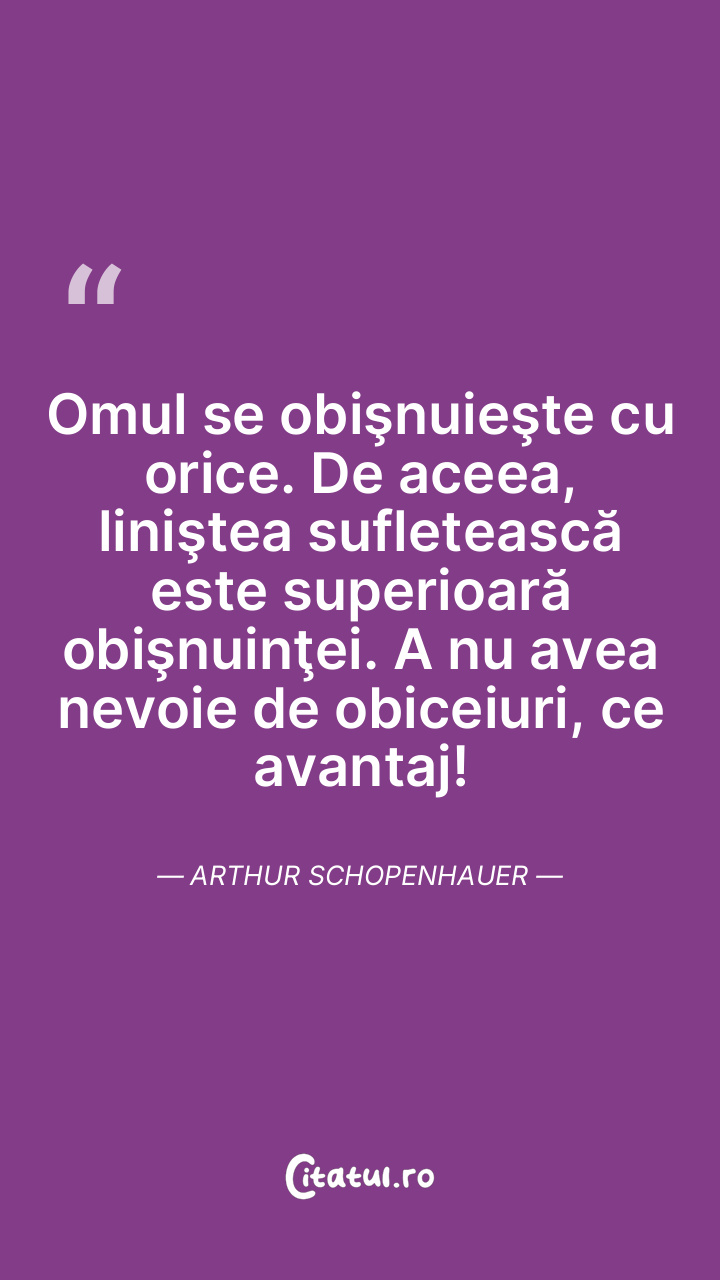 Omul se obişnuieşte cu orice. De aceea, liniştea sufletească este superioară obişnuinţei. A nu avea nevoie de obiceiuri, ce avantaj! Arthur Schopenhauer