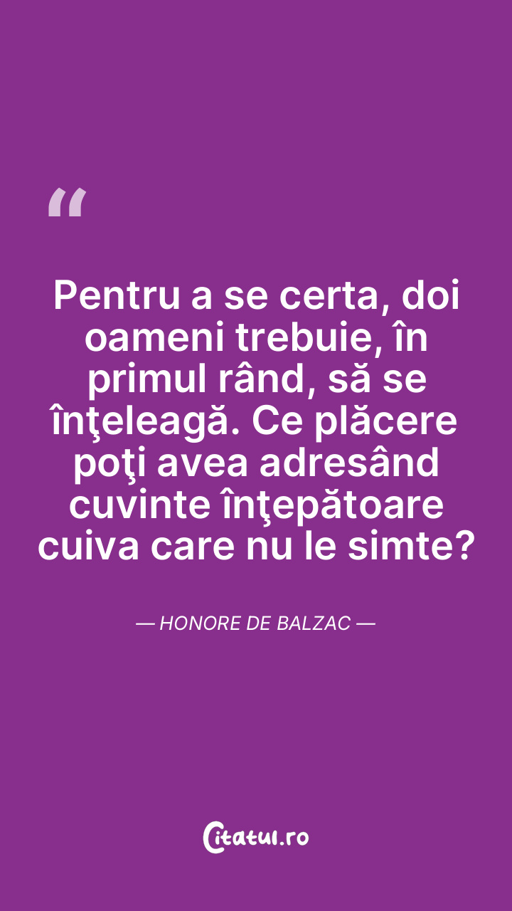 Pentru a se certa, doi oameni trebuie, în primul rând, să se înţeleagă. Ce plăcere poţi avea adresând cuvinte înţepătoare cuiva care nu le simte? Honore de Balzac