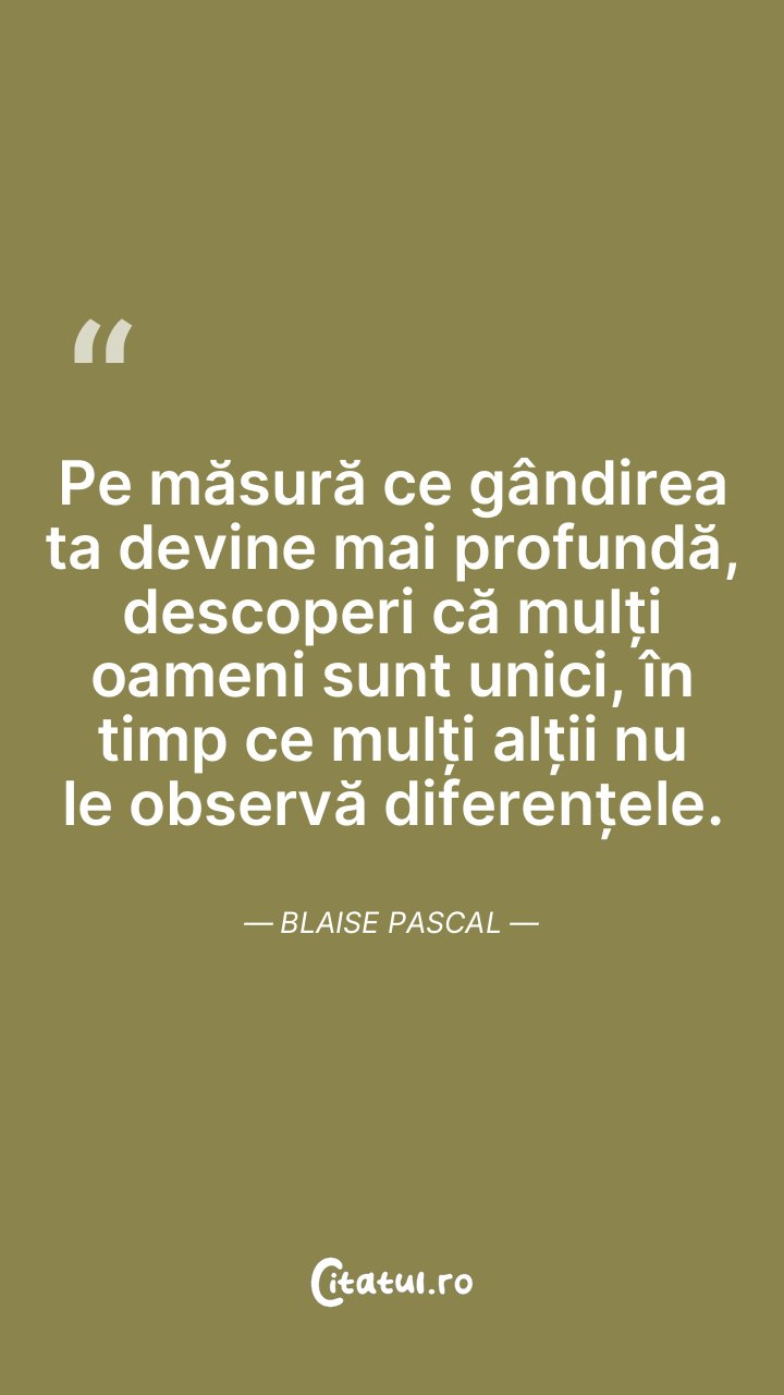Pe măsură ce gândirea ta devine mai profundă, descoperi că mulți oameni sunt unici, în timp ce mulți alții nu le observă diferențele. Blaise Pascal