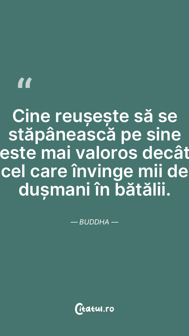 Cine reușește să se stăpânească pe sine este mai valoros decât cel care învinge mii de dușmani în bătălii. Buddha