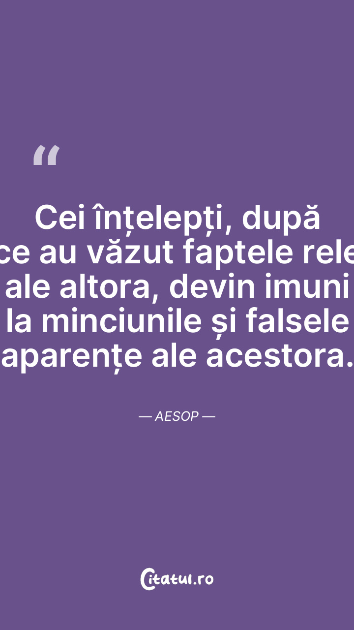 Cei înțelepți, după ce au văzut faptele rele ale altora, devin imuni la minciunile și falsele aparențe ale acestora. Aesop