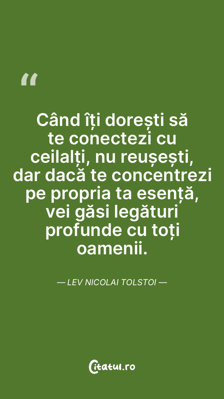 Când îți dorești să te conectezi cu ceilalți, nu reușești, dar dacă te concentrezi pe propria ta esență, vei găsi legături profunde cu toți oamenii. Lev Nicolai Tolstoi