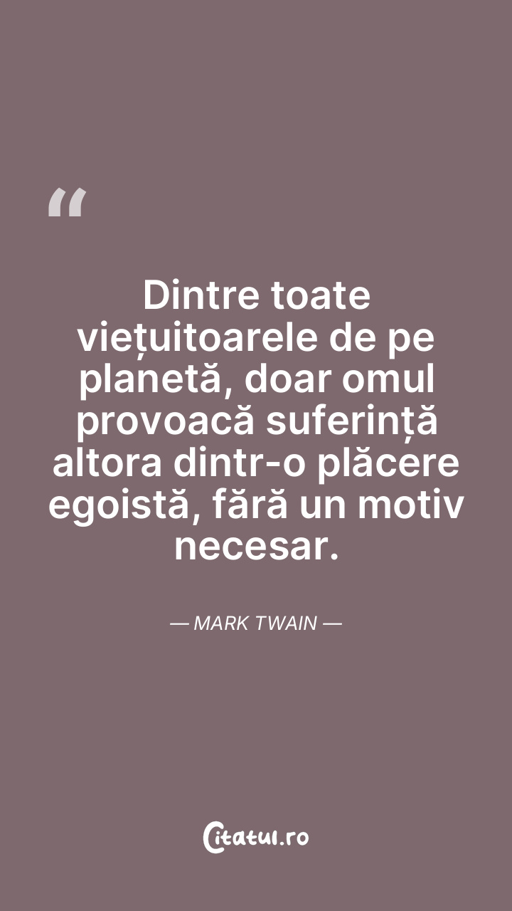 Dintre toate viețuitoarele de pe planetă, doar omul provoacă suferință altora dintr-o plăcere egoistă, fără un motiv necesar. Mark Twain
