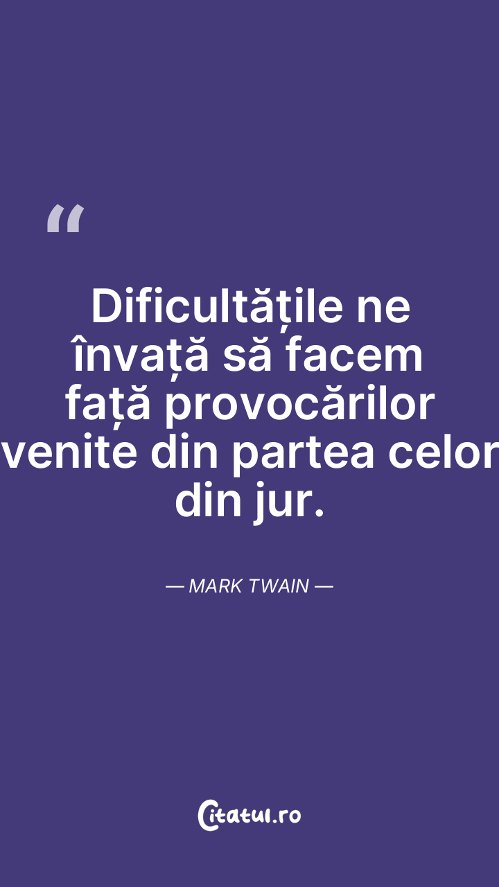 Dificultățile ne învață să facem față provocărilor venite din partea celor din jur. Mark Twain