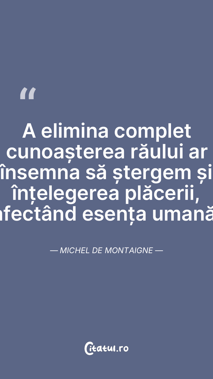 A elimina complet cunoașterea răului ar însemna să ștergem și înțelegerea plăcerii, afectând esența umană. Michel de Montaigne