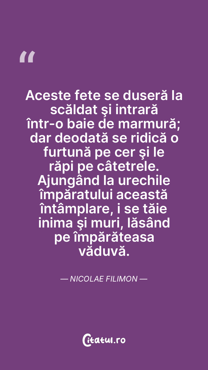 Aceste fete se duseră la scăldat şi intrară într-o baie de marmură; dar deodată se ridică o furtună pe cer şi le răpi pe câtetrele. Ajungând la urechile împăratului această întâmplare, i se tăie inima şi muri, lăsând pe împărăteasa văduvă. Nicolae Filimon