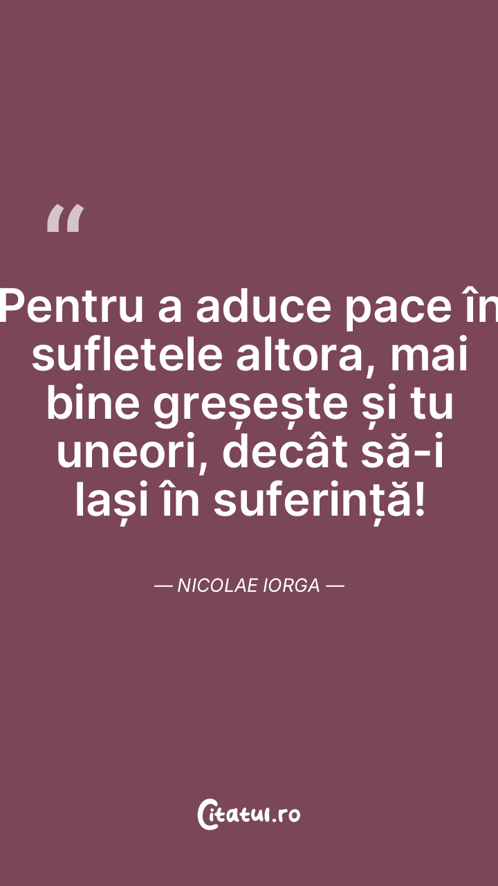 Pentru a aduce pace în sufletele altora, mai bine greșește și tu uneori, decât să-i lași în suferință! Nicolae Iorga