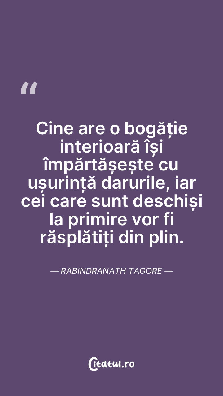 Cine are o bogăție interioară își împărtășește cu ușurință darurile, iar cei care sunt deschiși la primire vor fi răsplătiți din plin. Rabindranath Tagore
